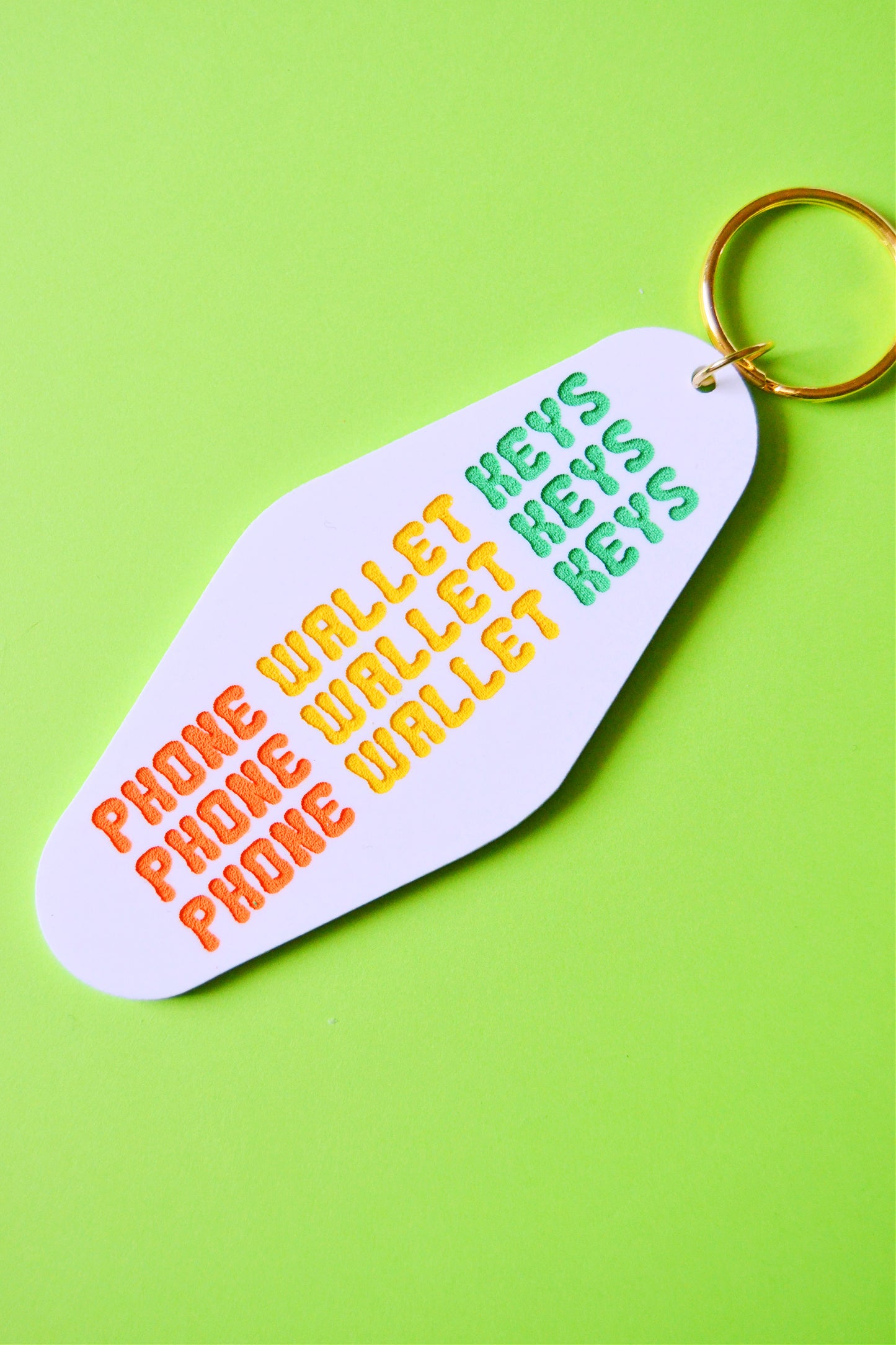 Perfect for your friend who's always forgetting something, this vintage motel-style keychain will remind them gently if they have their "phone, wallet, keys" over and over! Consider it a nagging mother in a keychain form :) Or don't, because that sounds awful! Either way, this keychain is made of lightweight acrylic, engraved and hand-painted and finished with a metal keyring.