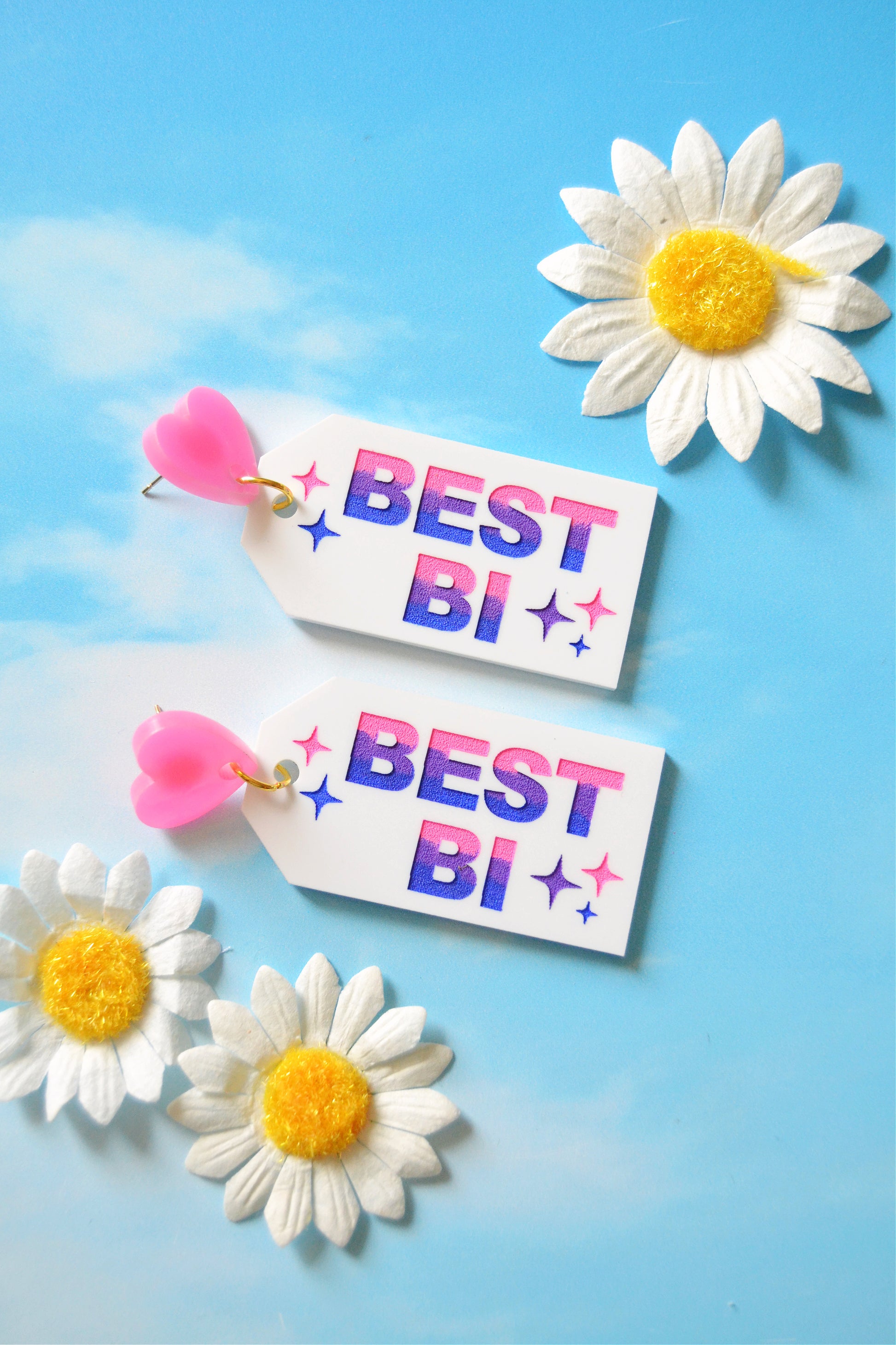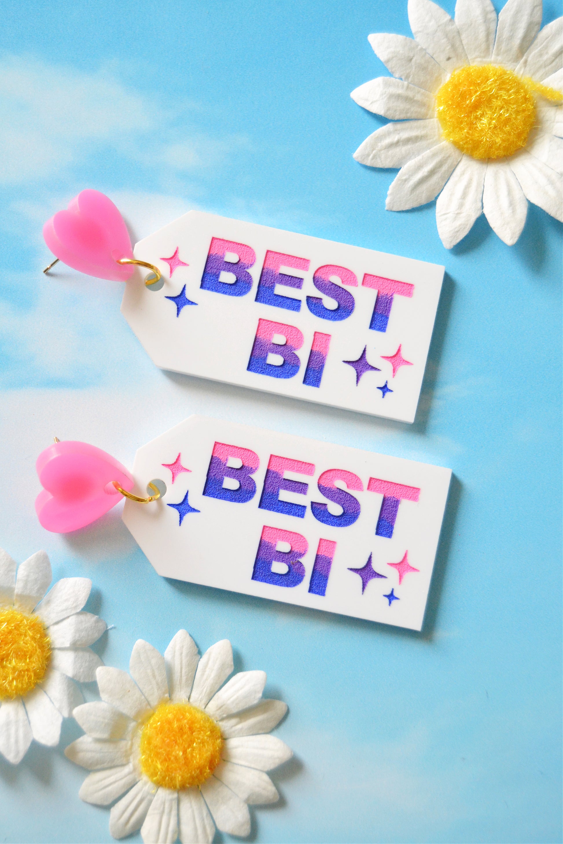 Laser-cut acrylic earrings engraved and hand-painted in the bisexual flag colors with the phrase "Best Bi" and finished with a heart charm topper with a hypoallergenic gold-plated stainless steel stud post backing for closure.