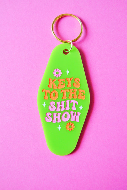 Laser-cut acrylic keychain engraved and hand-painted with the phrase "keys to the shit show" along with cute retro flowers and sparkles, then finished with a gold keyring. Approx. 3.45" in size.