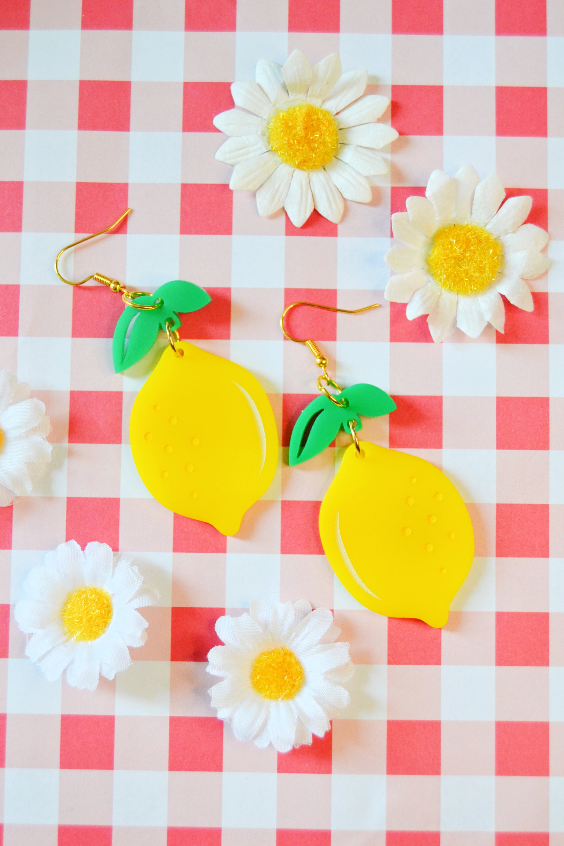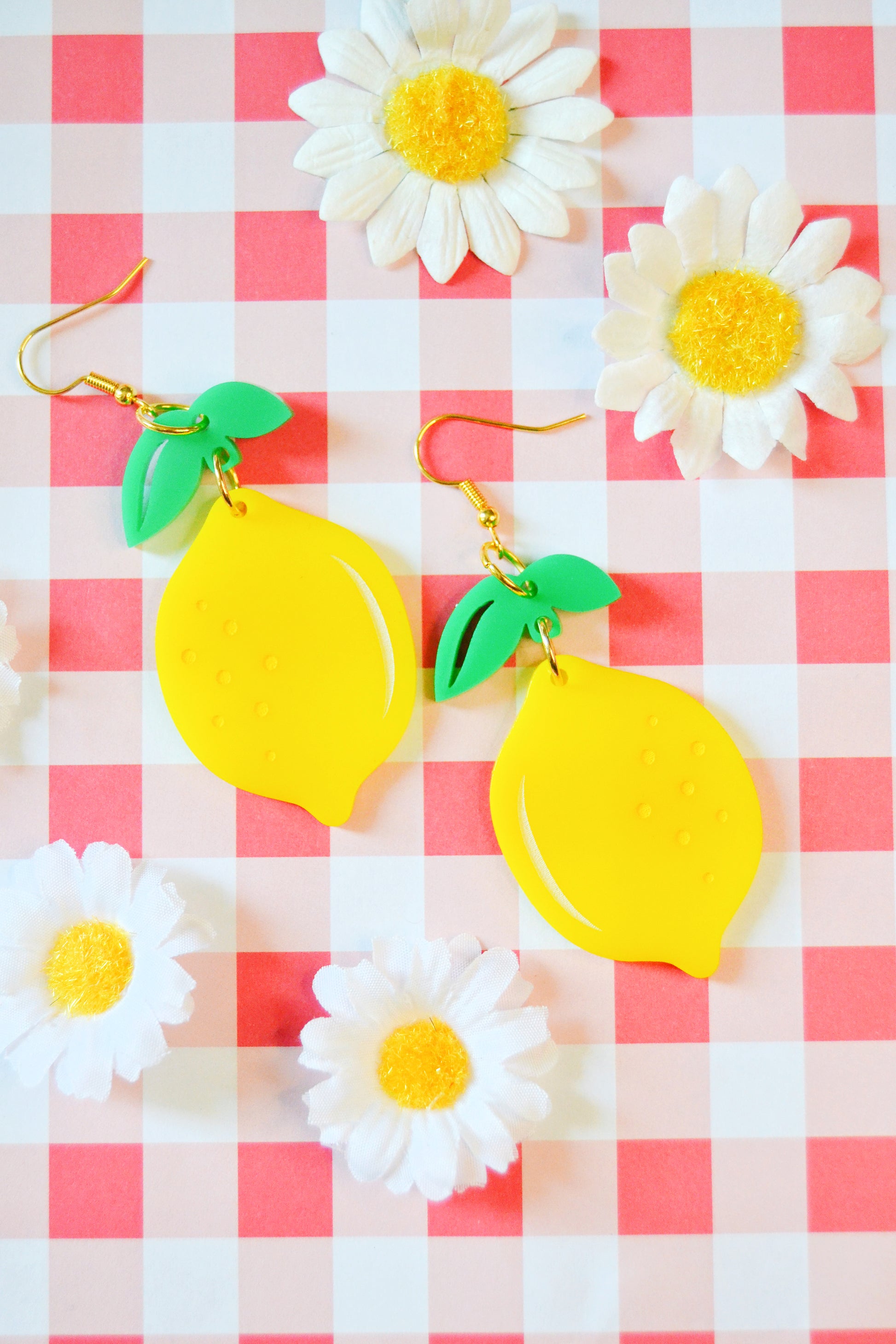 Laser-cut acrylic earrings engraved and hand-painted to look like juicy and perfectly ripe whole lemons and finished with hypoallergenic gold-plated stainless steel fish hooks for closure.