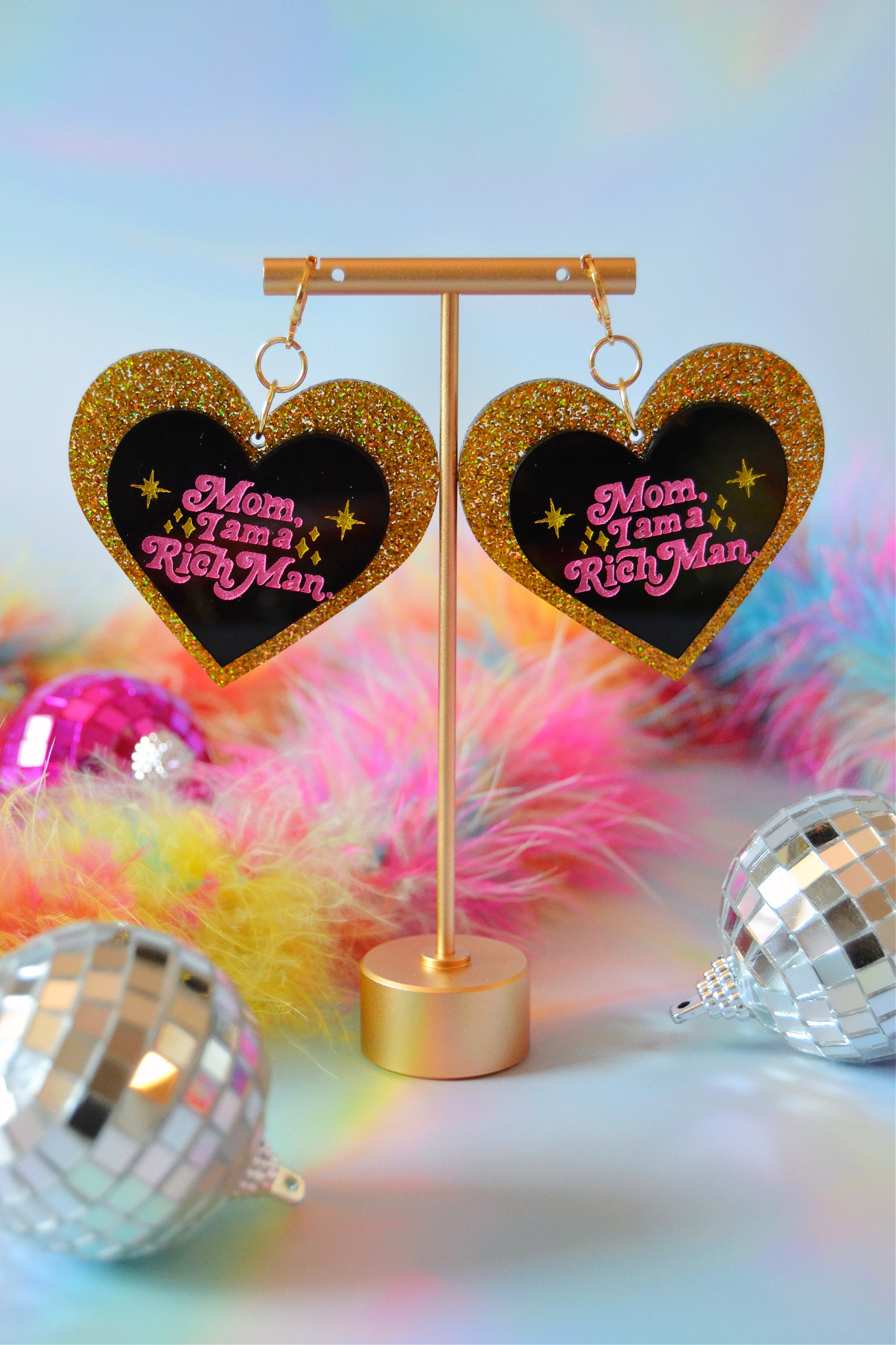 This is the second iteration of my Mom, I am a Rich Man earrings, this time with a holographic gold glitter background. If you're looking for the other version, it has a confetti chunky rainbow hex glitter background on another listing.