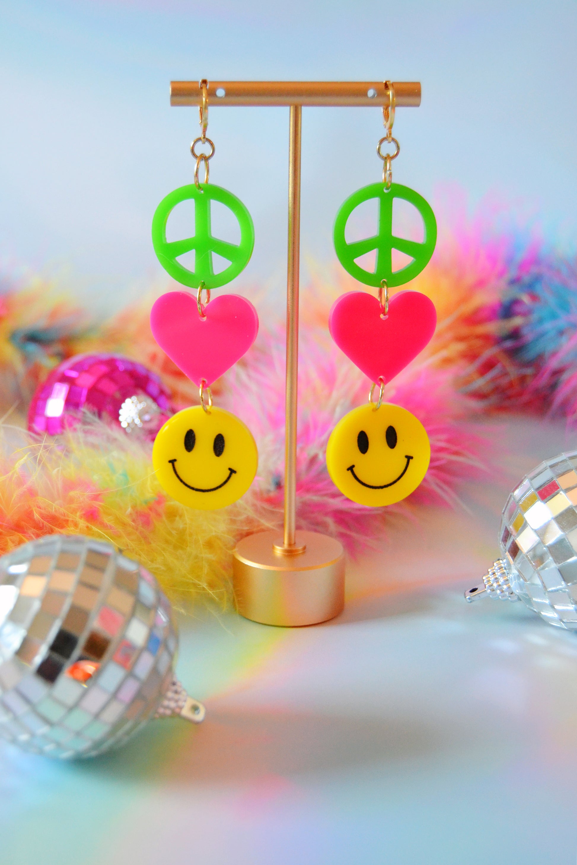 Anyway, now I'm making hippie earrings including these peace, love and happiness dangles which are too cute for words, but I'll try anyway. Made of laser-cut acrylic, they're fashioned in the shapes of peace signs, hearts, and smiley faces and finished off with hypoallergenic gold-plated brass leverback huggies for closure.