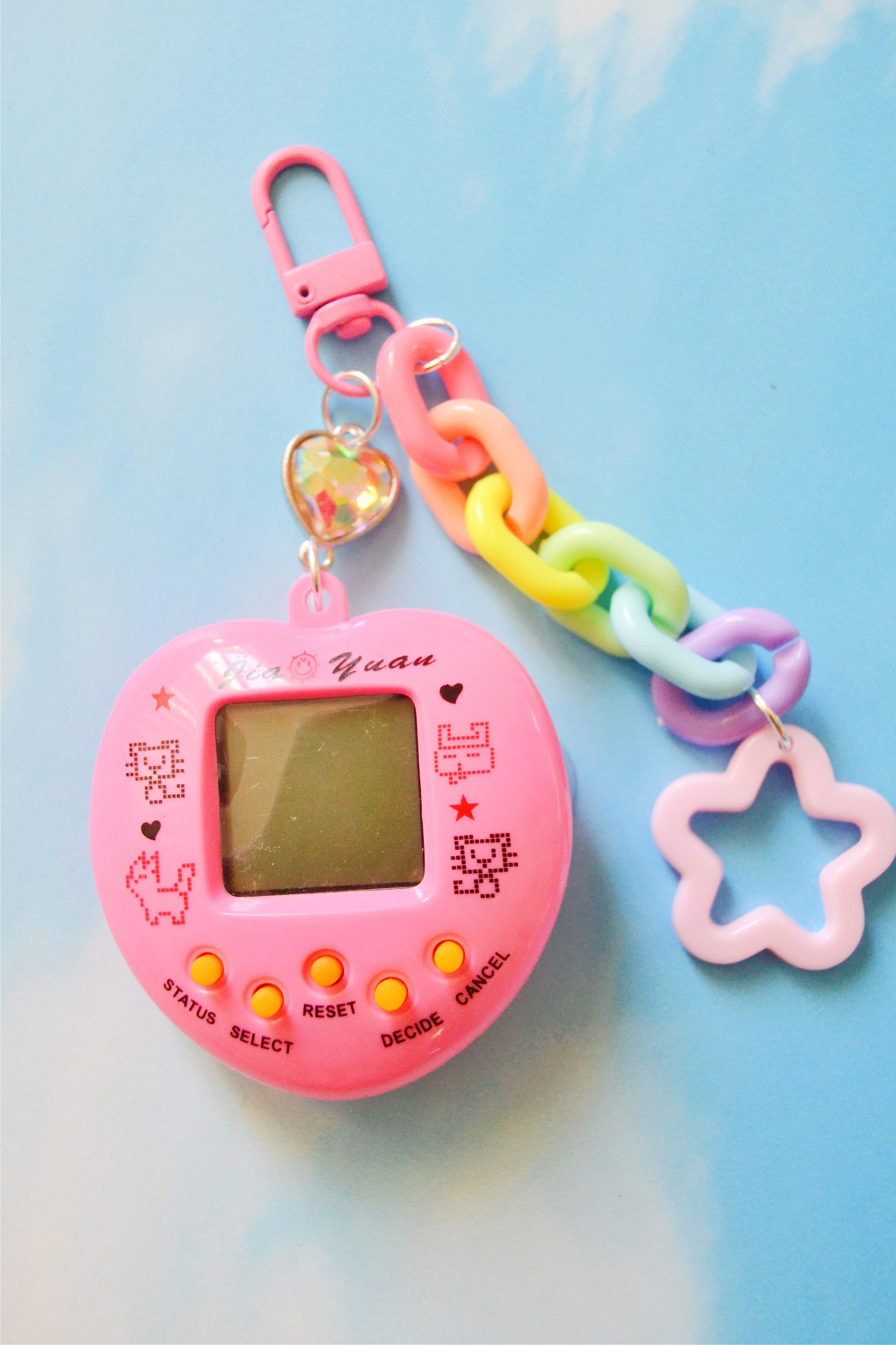 Featuring a workable digital pet keychain, this bag charm also has a rhinestone heart connector charm, a carabiner clip, an acrylic chain link and an acrylic star charm for added nostalgic fun.