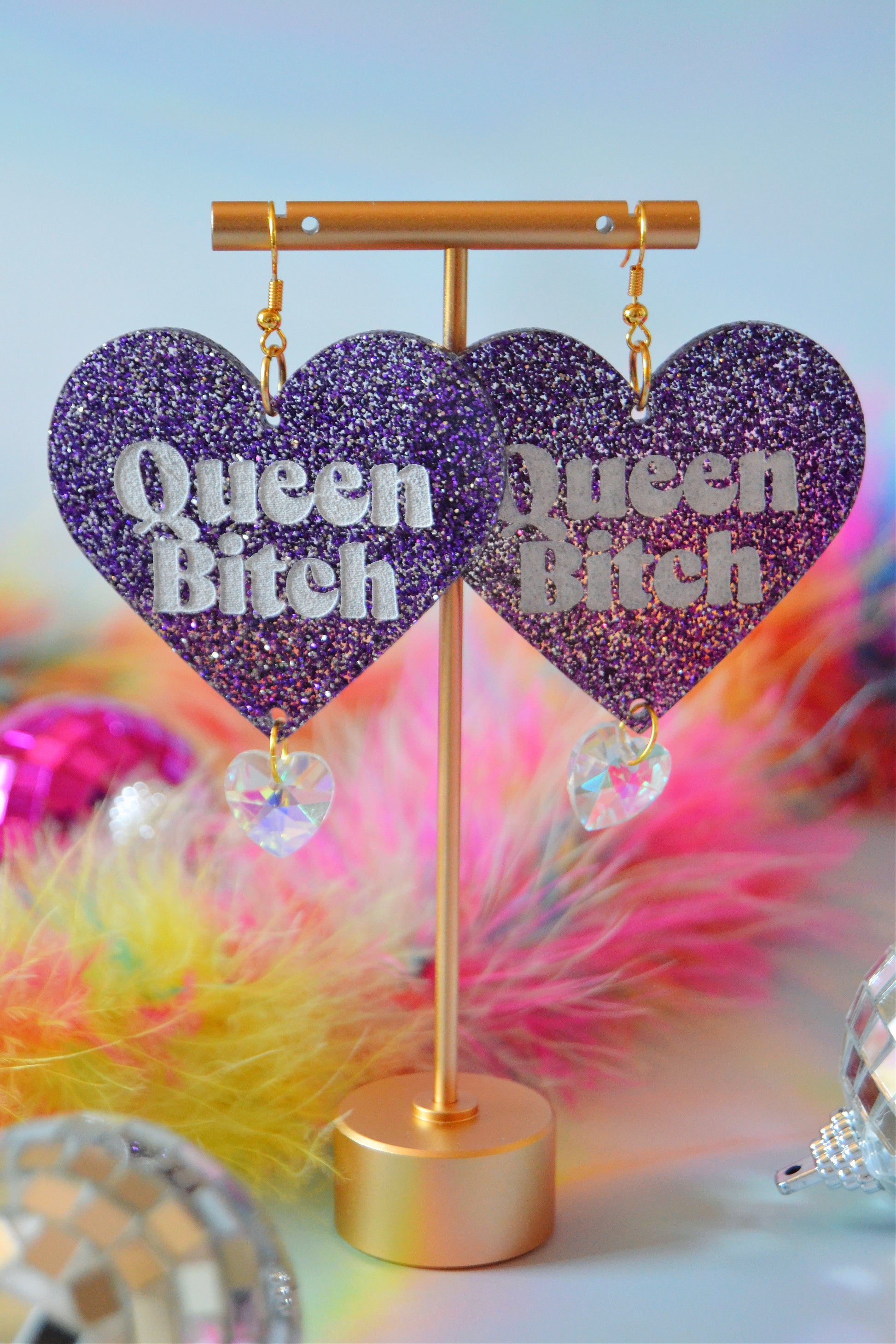 Made of laser-cut acrylic on a gorgeous shimmering purple glitter acrylic, they're engraved and hand-painted with the words "QUEEN BITCH" and finished with both a cool AB glass crystal heart suncatcher bead and hypoallergenic gold-plated brass fish hooks for closure.
