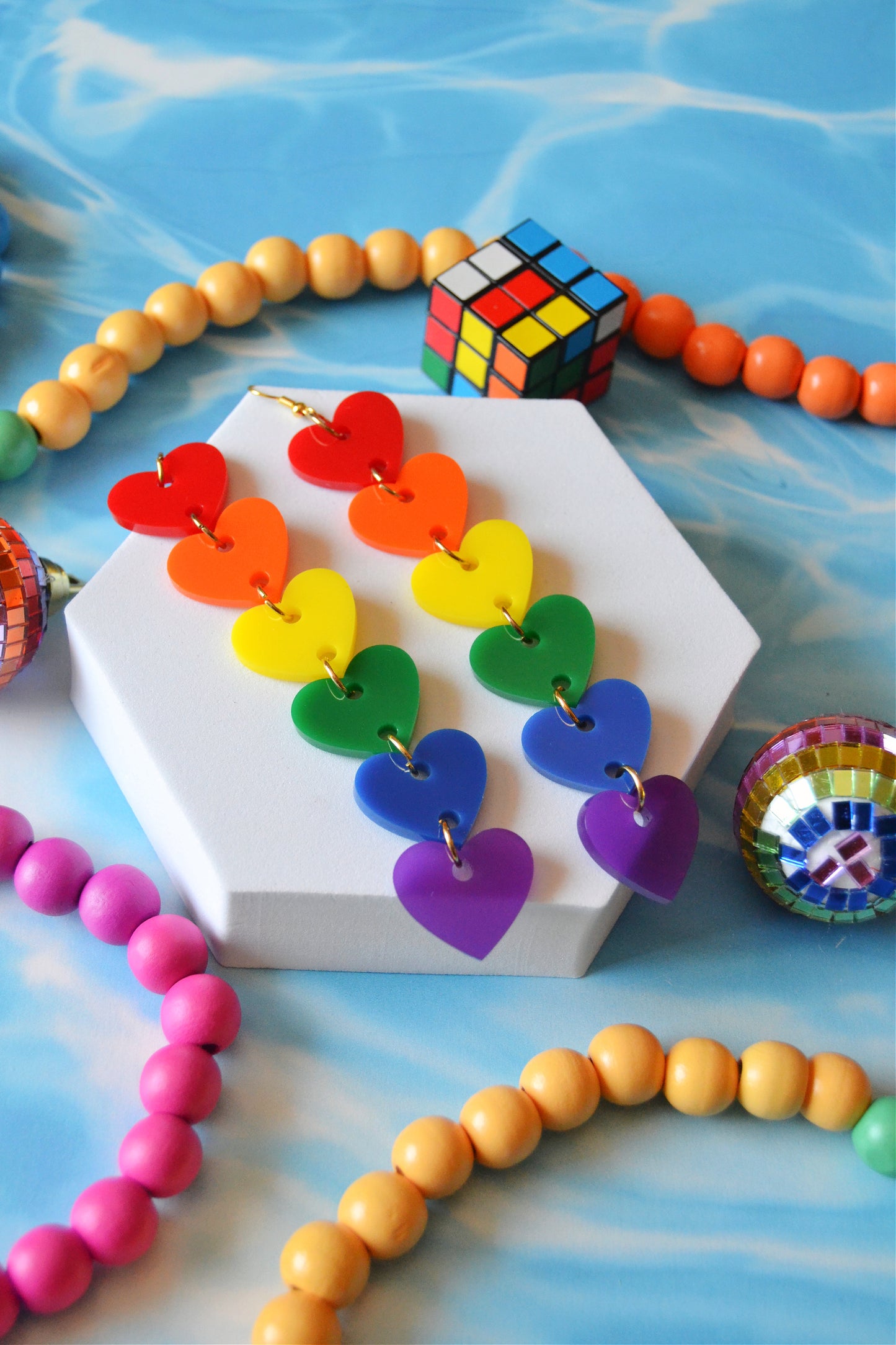 Show off your rainbow pride with these clavicle-grazing rainbow heart earrings!