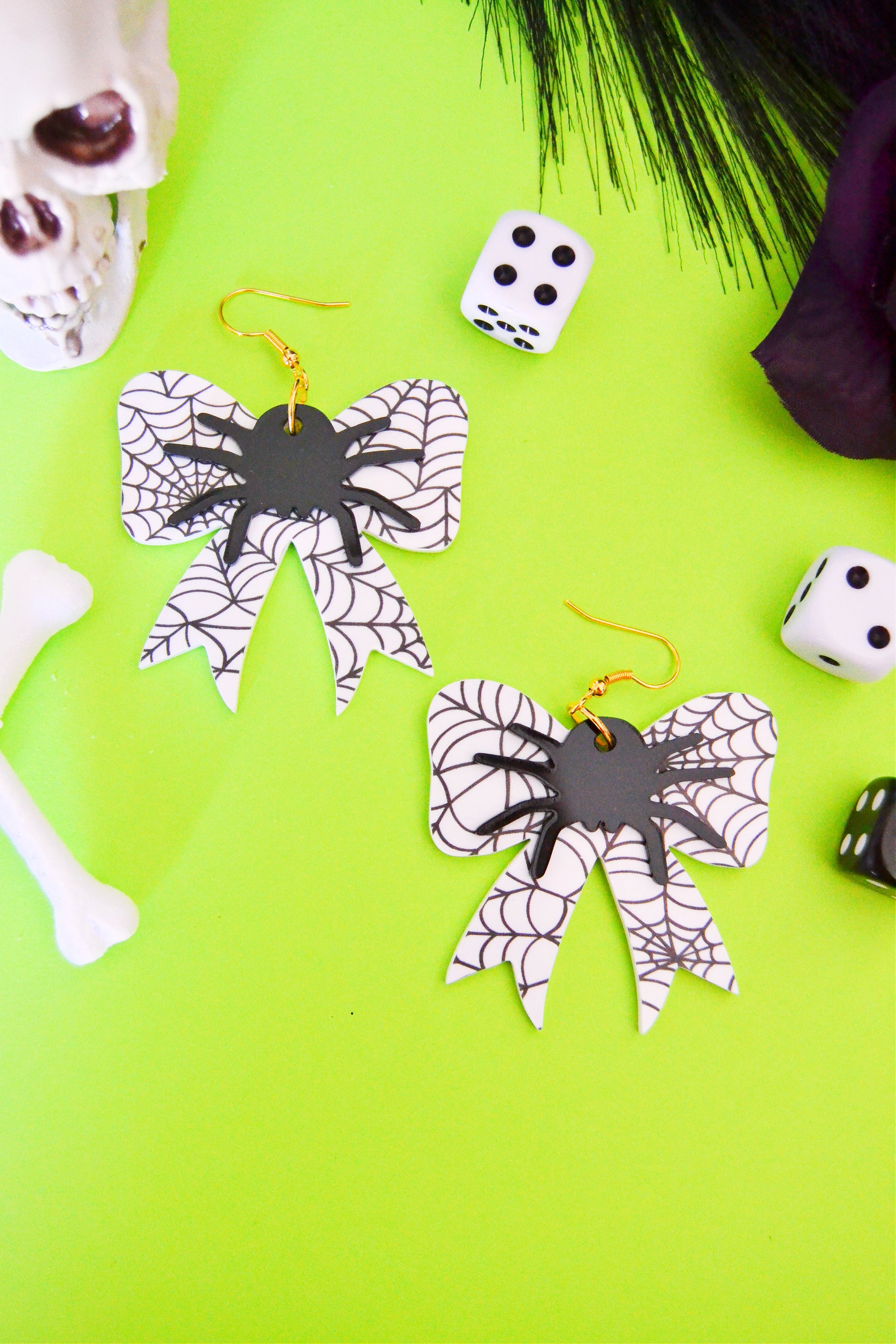 Laser-cut acrylic earrings assembled to look like bows with a spiderweb background and a black spider in the center, then finished with hypoallergenic gold-plated stainless steel fish hooks.