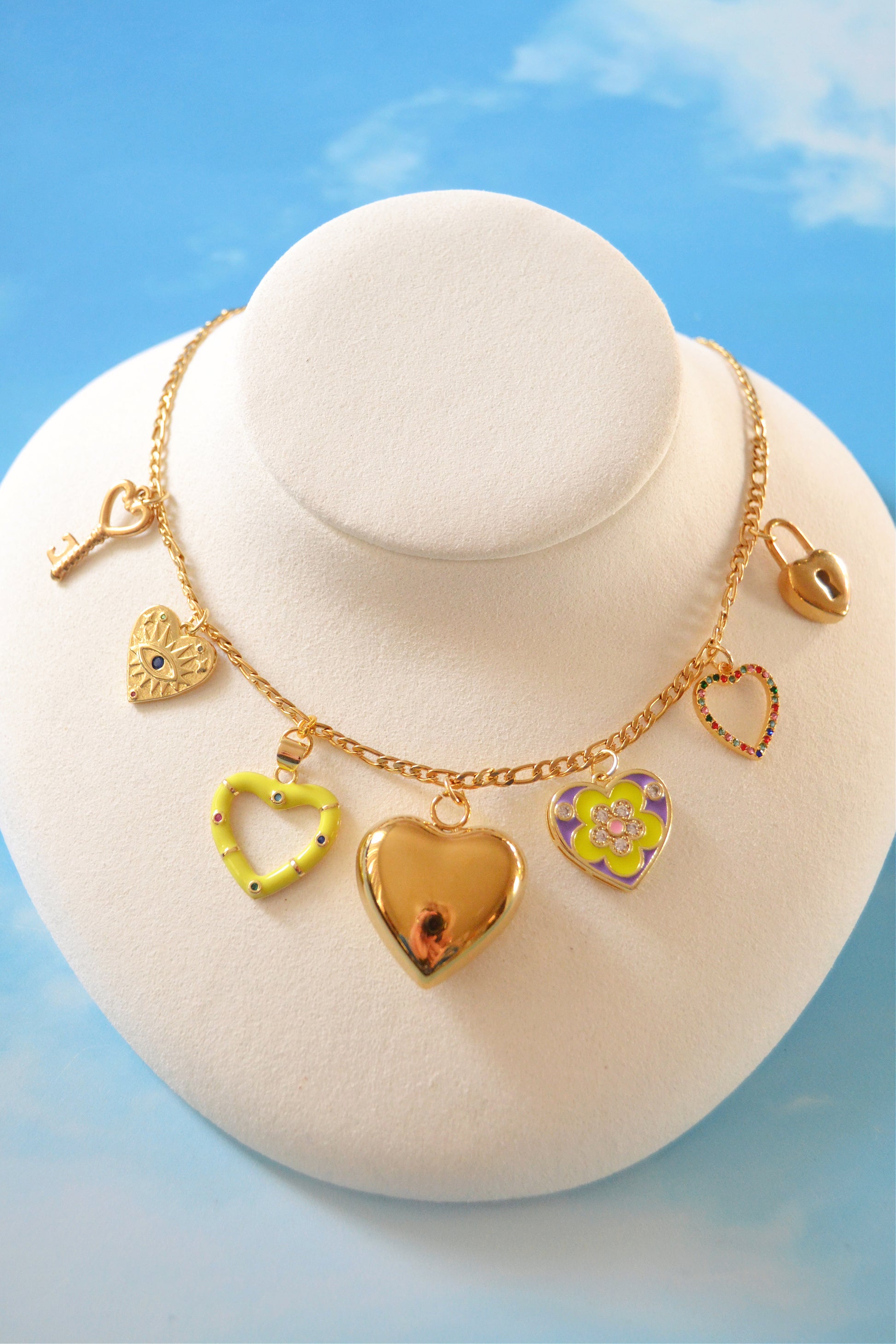This necklace is a "lover" themed one featuring a giant golden locket at the center along with enameled heart charms, a lock and key charm, a rhinestone encrusted heart and an evil eye heart charm.