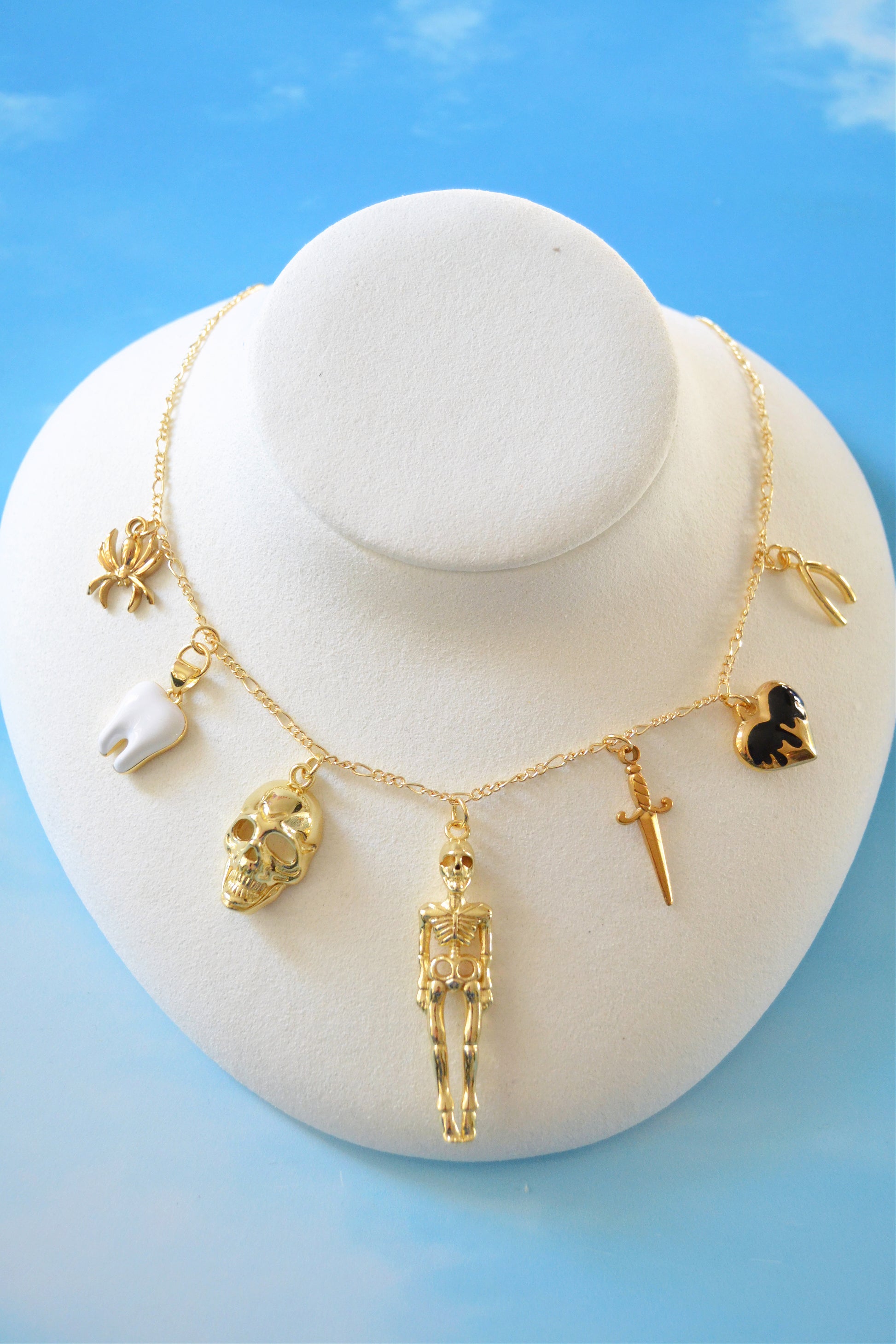 This necklace is a spooky one featuring a large golden skeleton at the forefront, along with a golden skull, gold and enameled flaming heart, wishbone, dagger, spider, and enameled tooth charms.